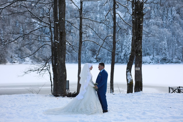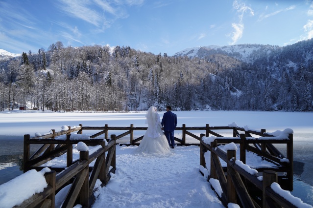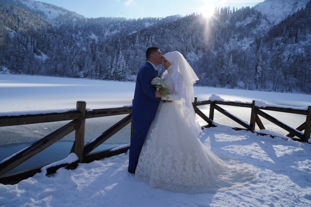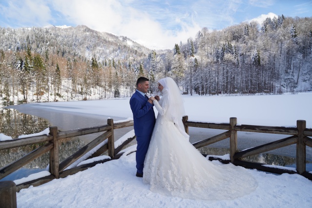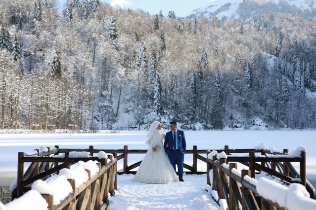 Öte yandan çiftin düğünleri kışa denk gelince, gelin ve damadın dış mekan fotoğraf çekimleri kar eşliğinde yapıldı. Çift doğal güzelliğiyle ünlü Borçka Karagöl’ün karla kaplı muhteşem doğası eşlinde bu mutlu günlerini ölümsüzleştirdiler.