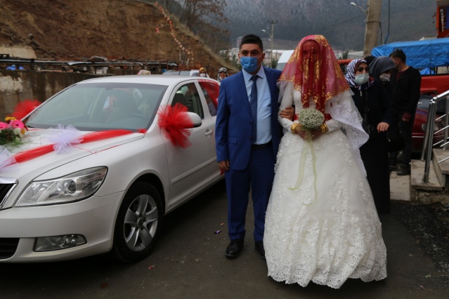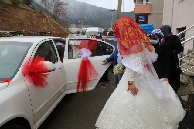 Sayılı davetliler eşliğinde, sosyal mesafe ve maske kuralına uygun bir şekilde gerçekleşen düğünde, bölgeye özgü örf ve adetler eşliğinde gelin baba ocağından gelinliğiyle çıkartıldı.