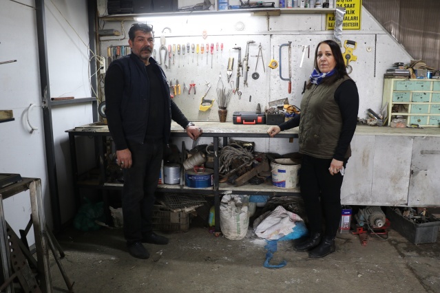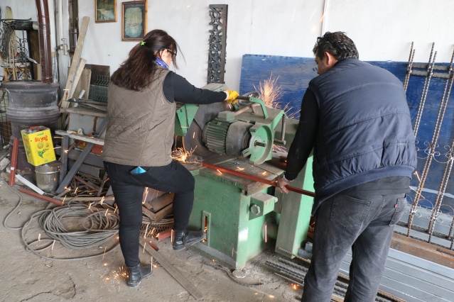 Yaklaşık 30 yıldır eşi Azize Küp ile birlikte demir atölyesi işlettiklerini anlatan Hayri Küp de “İlk önce çay kahve yapmak için gelmeye başladı. Sonrasında muhasebeye bakmaya başladı. Daha sonra ağır malzemelerde yardımcı olmaya başladı. Daha sonra kaynak yapmak istediğini söyledi. Taşlama yapıyor, boya yapıyor. Sağ olsun bize çok yardımcı oluyor. Eşim el attıktan sonra mesleğimizde ilerledik. O da kendini geliştirdi, bizde kendimizi geliştirdik. Kadının eli daha farklı, zanaatımızda aşağı yukarı beni geçti diyebiliriz. Azimlidir, severek de yapıyor farkındayım. Sağ olsun bizim çoğu yükümüzü aldı” dedi.