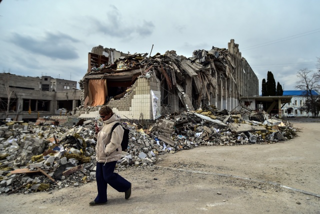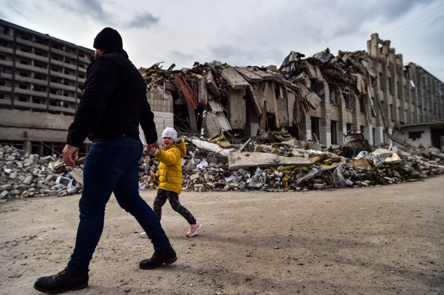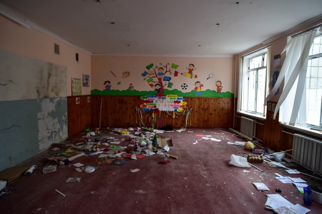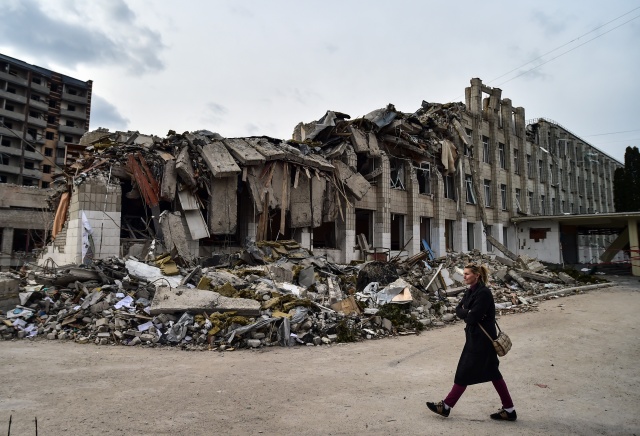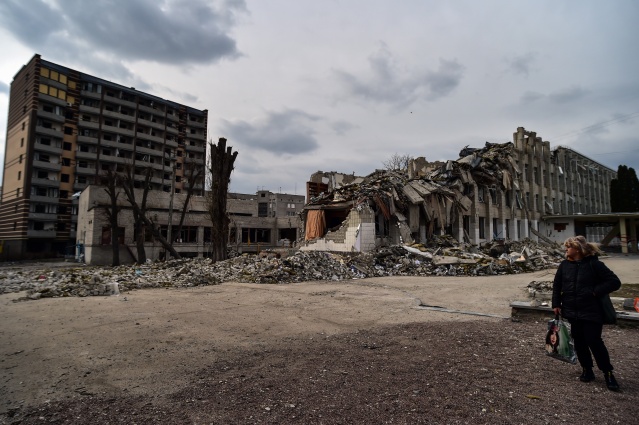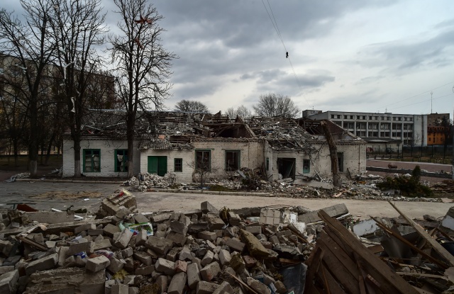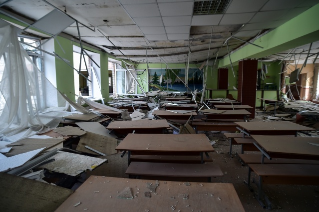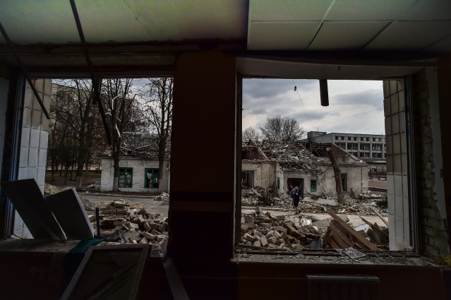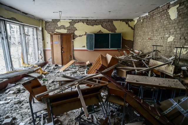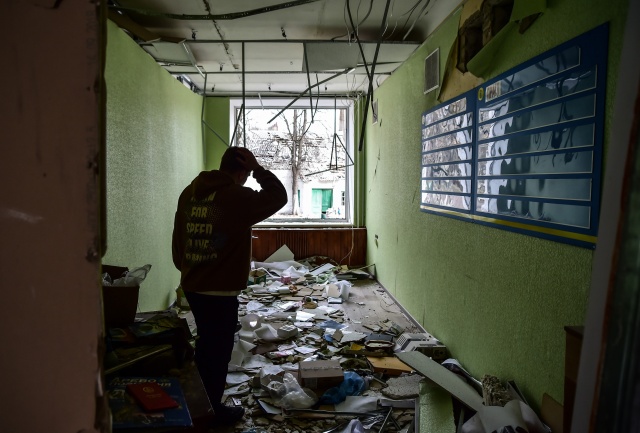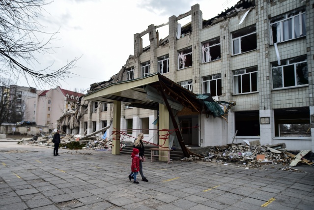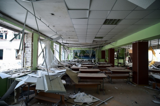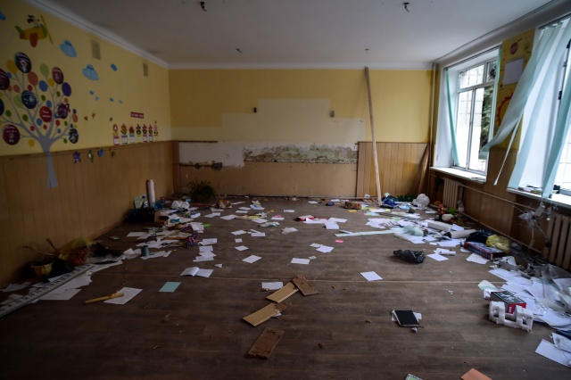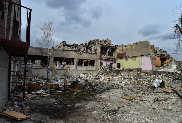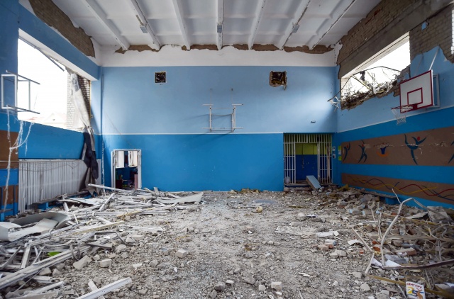 Kentte saldırı sonrası sivil evler yerle bir olurken, yıkılan okul binası ve çevresi Ukraynalı askerler tarafından koruma altına alındı.