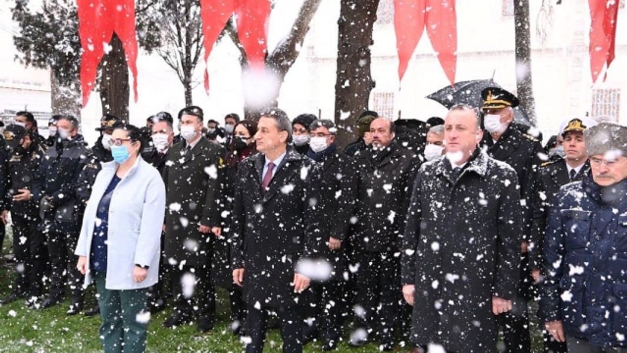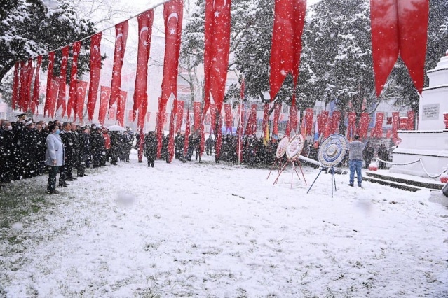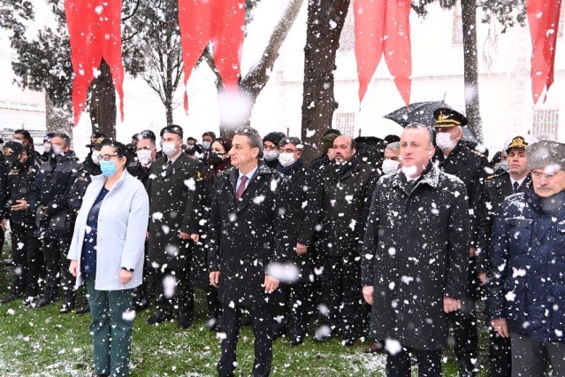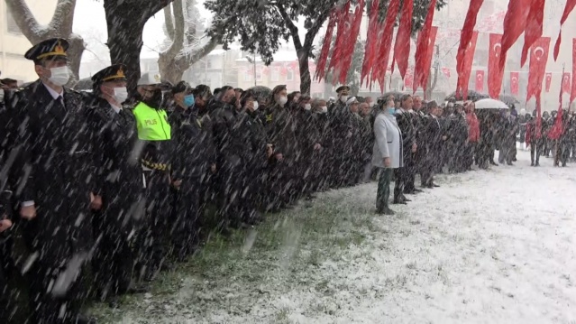 Sinop’ta 18 Mart etkinlikleri kapsamında, yoğun kara rağmen Şehitleri Anma Töreni gerçekleşti. Protokolün tören boyunca şemsiye kullanmaması dikkatlerden kaçmadı.