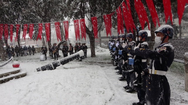 Sinop’ta 18 Mart Çanakkale Zaferi ve Şehitleri Anma programının 107. yıldönümünde tören, yoğun kar altında eksiksiz gerçekleşti. Törene katılan Sinop Valisi Erol Karaömeroğlu, Belediye Başkanı Barış Ayhan, Cumhuriyet Başsavcısı Duygu Bayar, kamu kurum ve kuruluş amirleri, askerler, polisler ve öğrenciler katıldı. Programda protokol, yoğun kara rağmen şemsiye kullanmadı. Sinop Deniz Şehitleri Anıtı önünde çelenk sunma töreniyle başlayan program, ardından saygı duruşu ve İstiklal Marşı sonrası 3 el saygı atışı ile devam etti.
