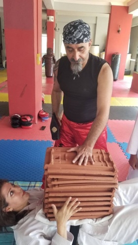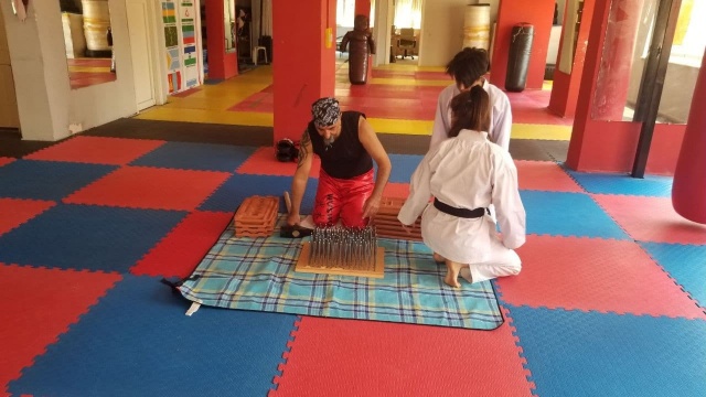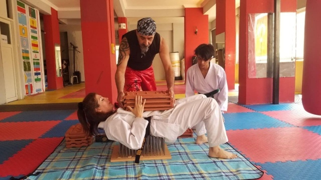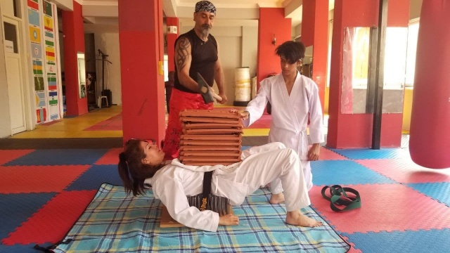 Genelde erkek karatecilerin yaptığı ölümcül gösteriye bu kez Manisa’da İranlı kadın karate antrenörü Reihaneh Rotivand Ghiyasvand imza attı. Üstü çivilerle dolu tablanın üzerine sırt üstü uzanan ve karnının üzerine yaklaşık 25 kiloluk 10 kiremit yerleştirilen Ghiyasvand, yaklaşık 25 kiloluk balyoz darbesiyle birlikte 50 kiloluk bir baskıyı başarılı bir şekilde karşılayarak şovunu tamamladı. Kiremitlerin kırılmasının ardından ‘Şükür iyiyim bir şey yok’ diyen Ghiyasvand, gösteriyi tüm dünyada kadın ve erkeklerin eşit olduğunu göstermek için gerçekleştirdiğini söyledi.
