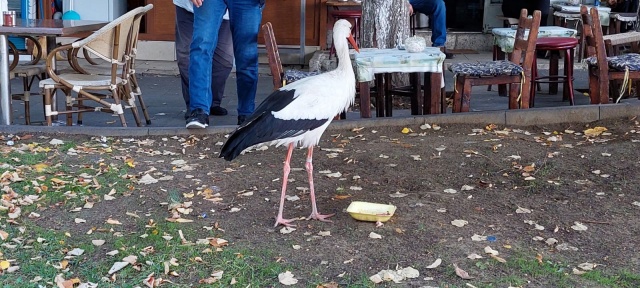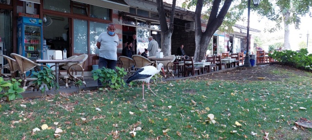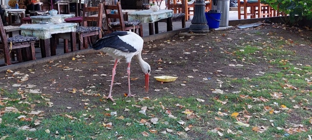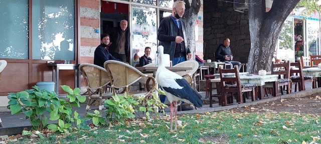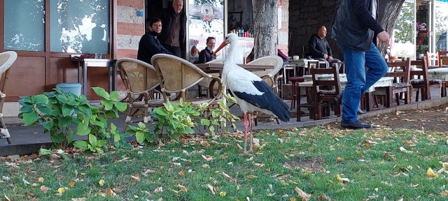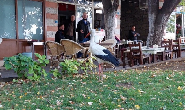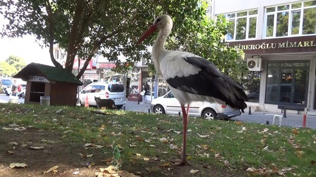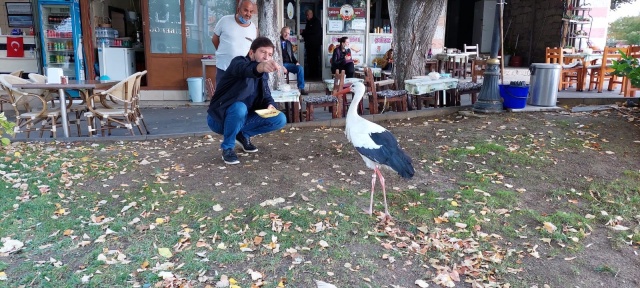 Hiç çekinmeden, kaçmadan esnafın elinden yiyecek yiyen leyleğin ise şimdilik oradan ayrılmak gibi bir niyeti gözükmüyor.