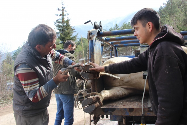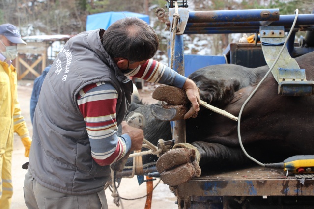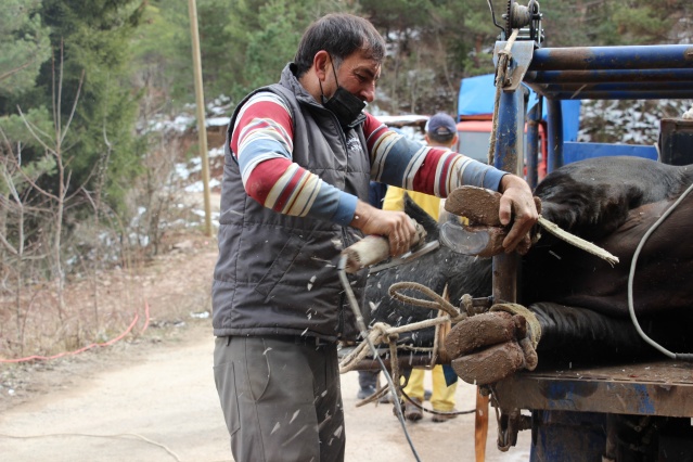 Aydın’dan boğalara nal çakmak için Artvin’e gelen ve 30 yıldır nalbantlığı büyük bir keyifle yaptığını dile getiren Turgut Aydın, “Artvin’de talep olduğundan boğalara nal çakmak için Aydın’dan geldik. Boğaların daha rahat spor yapabilmesi için boğalara tırnak bakımı ve nal çakımı işlemleri gerçekleştiriyoruz. Artvin arazisi taşlı olduğu için hayvanın kilo alması, rahat yürümesi ve sağlığı için nal çakılıyor. Bu işlemler çift süren boğalar için de yapılıyor ama genellikle güreşecek boğalar için yapılıyor. Güreş esnasında nallar boğanın çimlere tutunmasında da fayda sağlıyor. Pandemide boğa camiasında büyük sıkıntılar var. Aydın, Muğla, Denizli ve Artvin bölgesinde insanalar boğalarını kestirmeye başladı. Önümüzde ki dönemlerde boğa güreşleri olmazsa daha fazla boğa kesilecektir. Festivallerin yapılmasını istiyoruz. Seyircisiz olmasında razıyız, yeter ki boğalarımız güreşsin tek dileğimiz budur” ifadelerini kullandı.