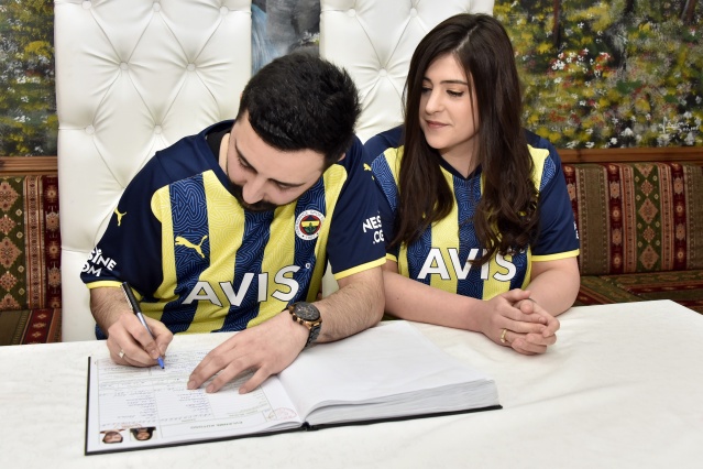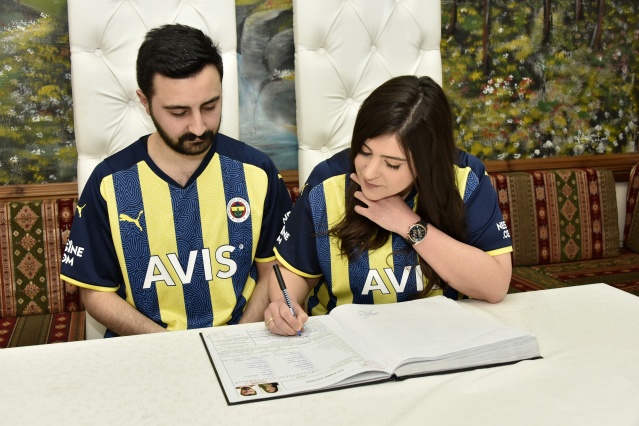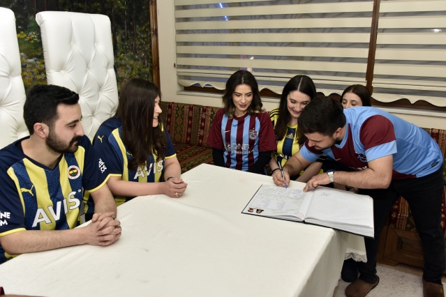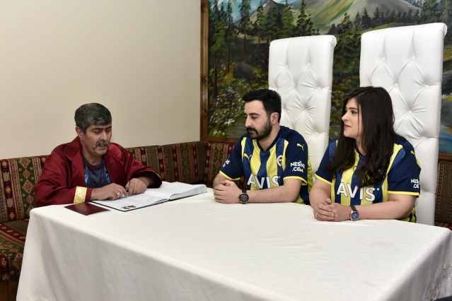 Gümüşhane’nin Torul ilçesinde Fenerbahçe formalarıyla nikah masasına oturan çiftin nikahını Trabzonspor formasıyla gelen Belediye Başkanı Evren Özdemir kıydı.