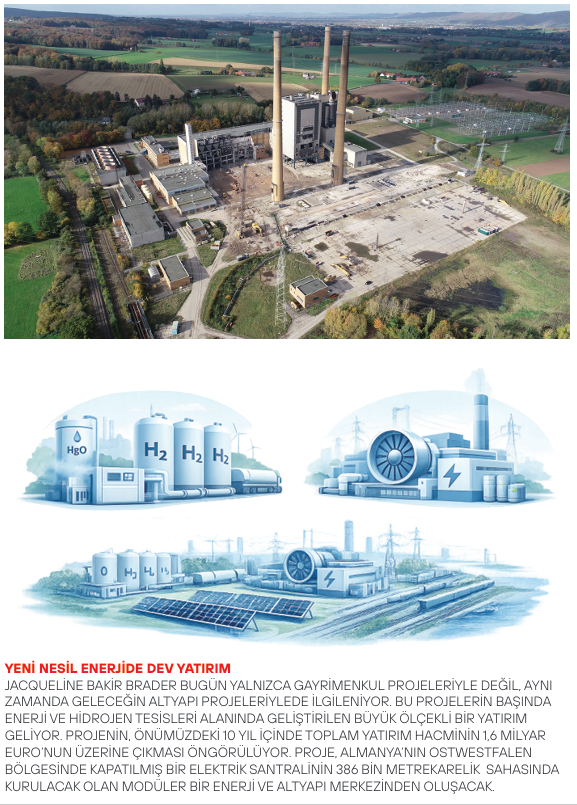 Jacqueline Bakir Brader, bugün yalnızca gayrimenkul projeleriyle değil, aynı zamanda geleceğin altyapı projeleriyle de ilgileniyor. Bu projelerin başında enerji ve hidrojen tesisleri alanında geliştirilen büyük ölçekli bir yatırım geliyor. Projenin, önümüzdeki 10 yıl içinde toplam yatırım hacminin 1,6 milyar Euro’nun üzerine çıkması öngörülüyor. Bu proje kapsamında; yenilenebilir enerji, enerji altyapısı ve yeni nesil enerji teknolojileri bir araya getiriliyor. Almanya’da hayata geçirilecek olan entegre enerji ve hidrojen tesislerinde, 225 MW elektroliz kapasitesi, 150 MW hidrojen uyumlu türbin ve 30 MW güneş enerjisi (PV) kurulması planlanıyor. Hidrojen uyumlu projede elde edilen hidrojenin üretimi yılda yaklaşık 17,8 bin ton ile 25,9 bin ton arasında öngörülüyor. Proje, Almanya’nın Ostwestfalen bölgesinde kapatılmış bir elektrik santralinin 386 bin metrekarelik sahasında kurulacak olan modüler bir enerji ve altyapı merkezinden oluşacak.