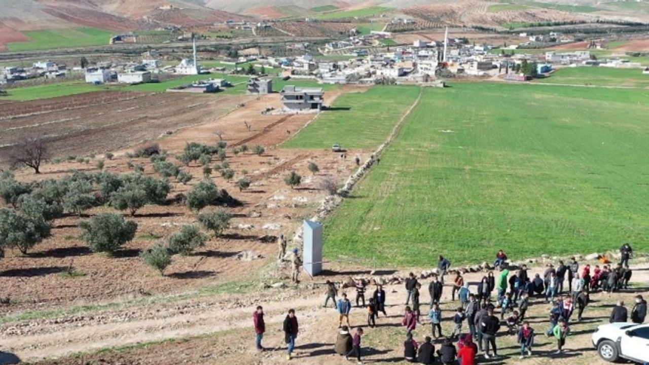 Göbeklitepe yakınlarında araziye yerleştirilmiş üzerinde Göktürk alfabesiyle, "Gök yüzüne bak ayı gör" yazılı metal blok drone ile havadan görüntülendi.