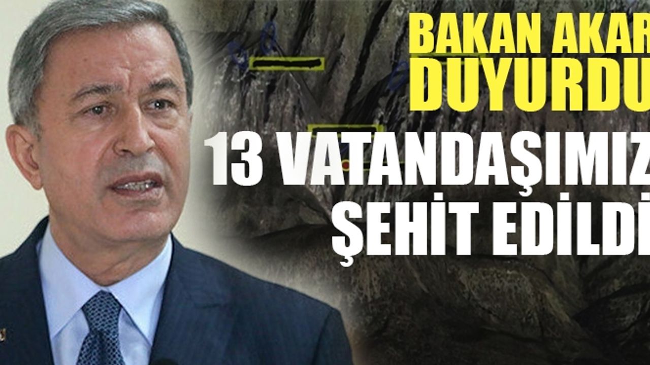 Bölgede kontrol altına alınan bir mağarada yapılan arama çalışmalarında 13 vatandaşın naaşına ulaşıldığını ifade eden Akar, "Yapılan ilk incelemede masum ve silahsız vatandaşlarımızdan birinin omuzundan, diğer 12 vatandaşımızın başlarından vurularak şehit edildikleri tespit edilmiştir" dedi. Akar "Sağ olarak ele geçirilen iki teröristin verdiği ilk bilgilerde ise vatandaşlarımızın mağaraya yönelik harekatın başlangıcında sözde mağara sorumlusu terörist tarafından şehit edildikleri ifade edilmiştir" diye konuştu.