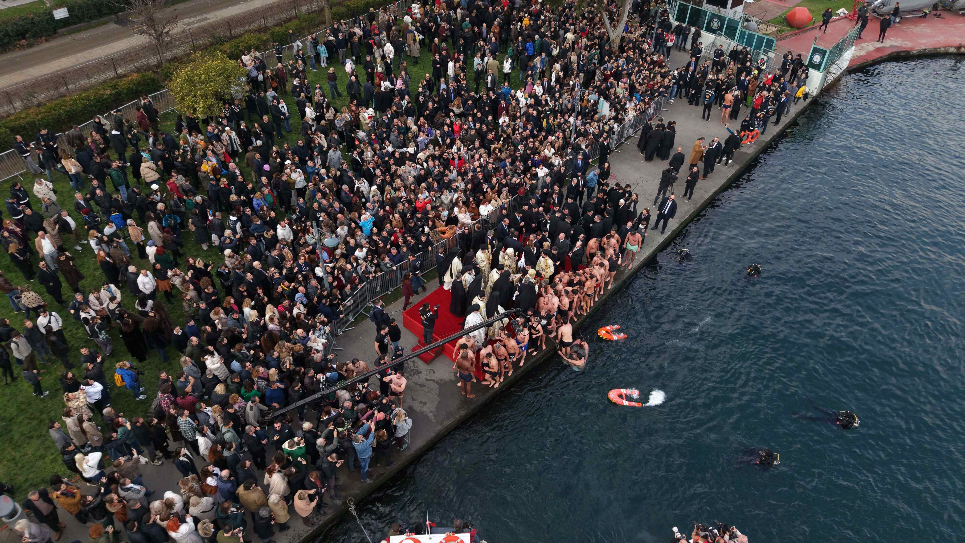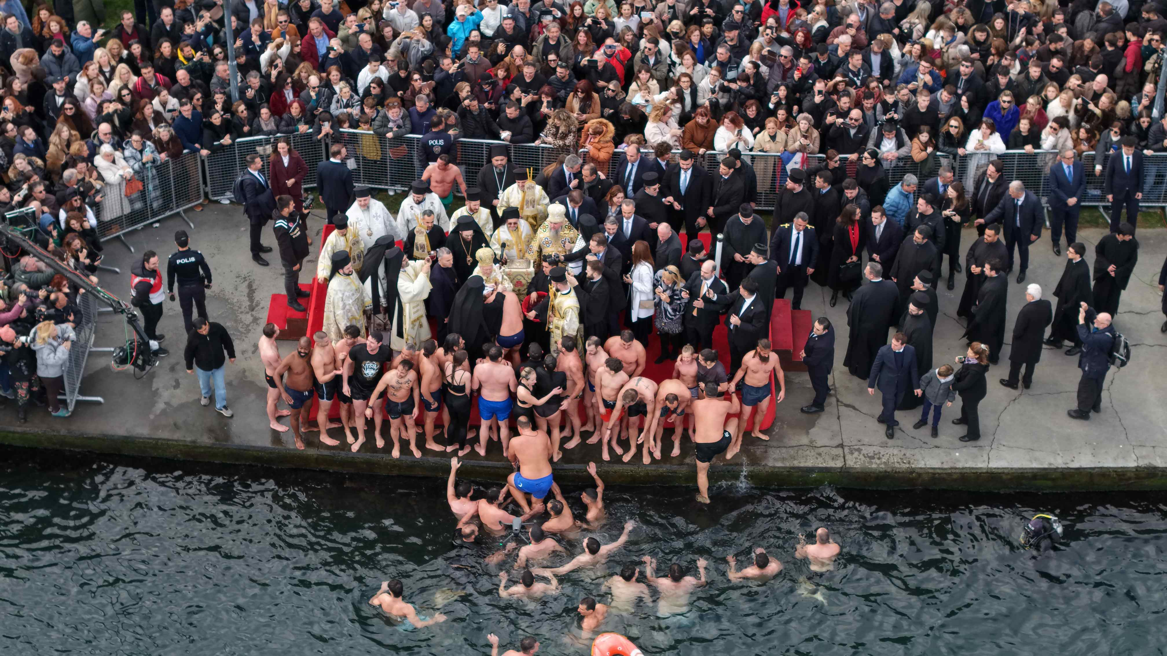 Denize atlayan gençler, Patrik Bartholomeos'un attığı haçı çıkarmak için birbiriyle yarıştı. O anlar ise dronla görüntülendi.