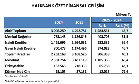 Halkbank, 2025 yılının son çeyreğine ilişkin finansal sonuçlarını açıkladı. Buna göre Halkbank’ın aktif büyüklüğü 2025 yıl sonu itibarıyla bir önceki yıla göre yüzde 43 artarak 4,3 trilyon TL’ye ulaştı. Banka’nın nakdi kredileri geçen yıla göre yüzde 36 büyüme ile 2 trilyon TL’ye; gayri nakdi kredileri de yüzde 47 artışla 1,2 trilyon TL seviyesine yükseldi. Böylece Halkbank’ın toplam kredi hacmi yüzde 40 artarak 3,2 trilyon TL’ye çıktı. Aynı dönemde mevduat büyüklüğünü 2024 yıl sonuna göre yüzde 46 artışla 3,5 trilyon TL’ye ulaştıran Banka’nın özkaynakları da yüzde 43 yükselişle 218 milyar TL oldu. Menkul değerler portföyü ise yüzde 52 artış göstererek 1,2 trilyon TL seviyesine ulaştı.