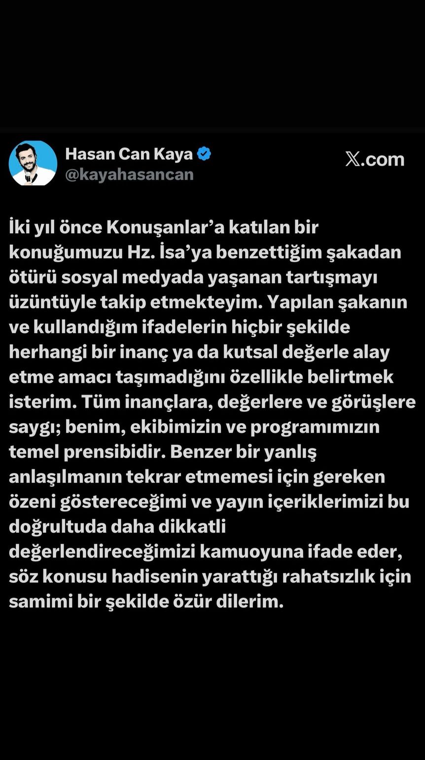 “İki yıl önce programa katılan bir konuğumuzu Hz. İsa'ya benzettiğim şakadan ötürü sosyal medyada yaşanan tartışmayı üzüntüyle takip etmekteyim. Yapılan şakanın ve kullandığım ifadelerin hiçbir şekilde herhangi bir inanç ya da kutsal değerle alay etme amacı taşımadığını özellikle belirtmek isterim. Tüm inançlara, değerlere ve görüşlere saygı; benim, ekibimizin ve programımızın temel prensibidir. Benzer bir yanlış anlaşılmanın tekrar etmemesi için gereken özeni göstereceğimi ve yayın içeriklerimizi bu doğrultuda daha dikkatli değerlendireceğimizi kamuoyuna ifade eder, söz konusu hadisenin yarattığı rahatsızlık için samimi bir şekilde özür dilerim.”