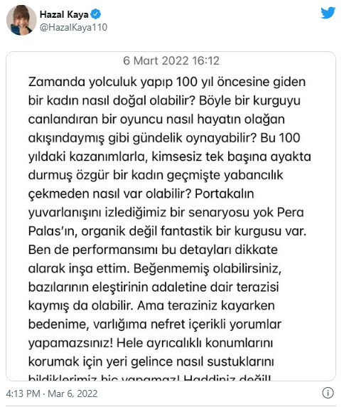 Kaya, “Beğenmemiş olabilirsiniz, bazılarının eleştirinin adaletine dair terazisi kaymış da olabilir. Ama teraziniz kayarken bedenime, varlığıma nefret içerikli yorumlar yapamazsınız! Hele ayrıcalıklı konumlarını korumak için yeri gelince nasıl sustuklarını bildiklerimiz hiç yapamaz! Haddiniz değil!” ifadelerini kullandı.