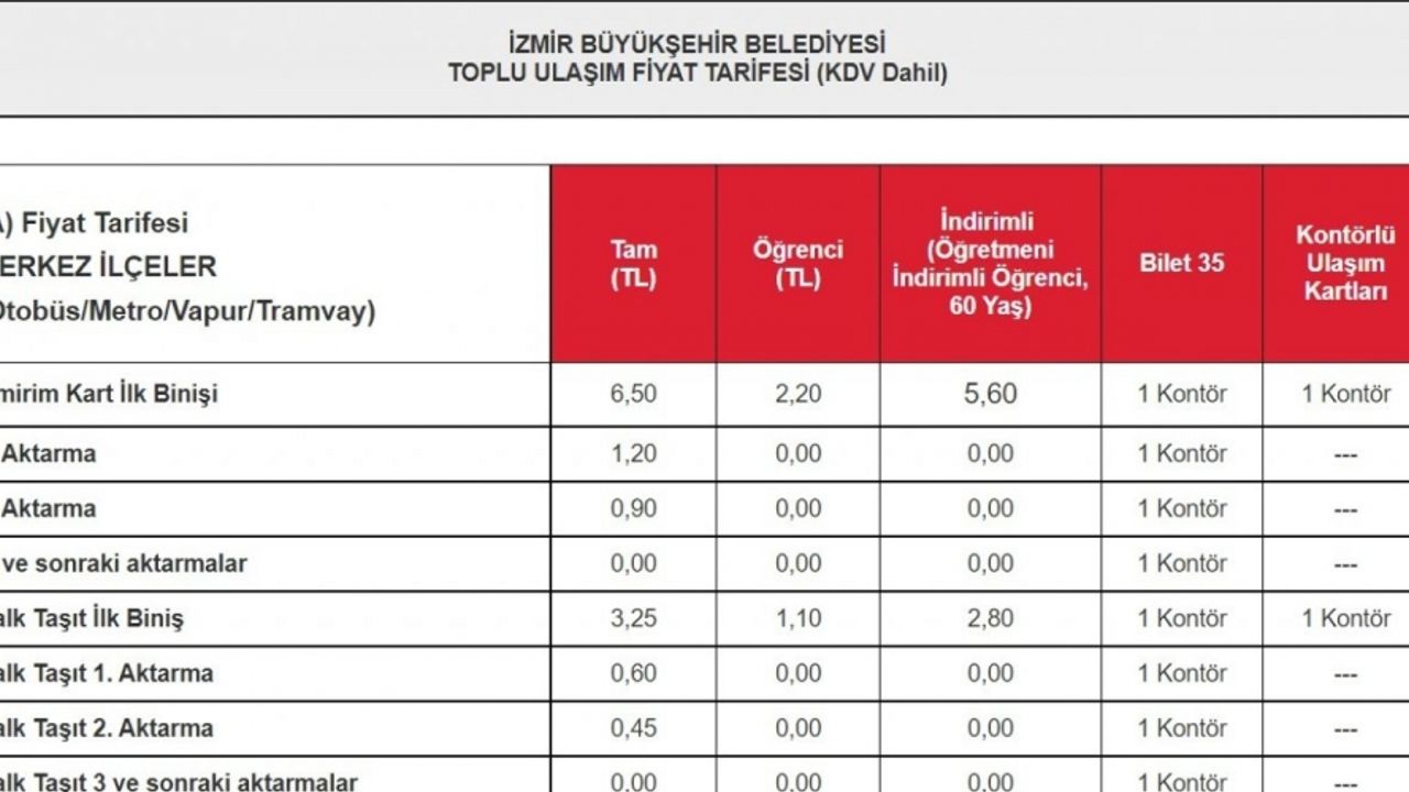 İzmir’de ulaşım ücretlerine uygulanan Üretici Fiyat Endeksi (ÜFE) zammı geri çekildi. İlk biniş tam ücreti 6,50 olurken, 120 dakika içinde 1. aktarma 1,20 TL, 2. aktarma 0,90 TL, 3. ve sonraki aktarmaların ise tüm fiyata dahil olduğu belirtildi. 2,40 TL olan öğrenci bileti ücretleri ise 2,20 TL oldu. Karara göre öğretmen ve 60 yaş kart ücretleri de 5 lira 60 kuruş olarak belirlendi.