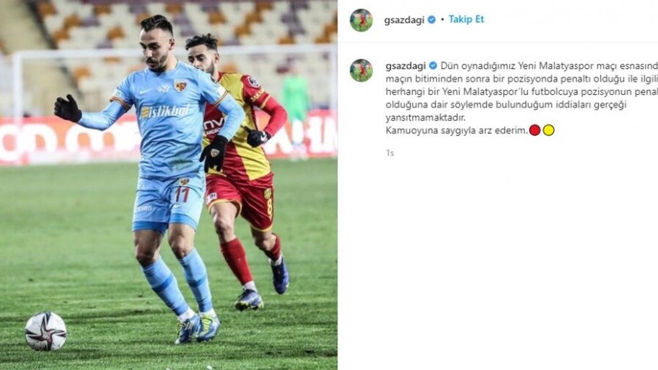 Gökhan Sazdağı sosyal paylaşım sitesindeki hesabı üzerinden yaptığı açıklamada, "Dün oynadığımız Yeni Malatyaspor maçı esnasında veya maçın bitiminden sonra bir pozisyonda penaltı olduğu ile ilgili herhangi bir Yeni Malatyasporlu futbolcuya pozisyonun penaltı olduğuna dair söylemde bulunduğum iddiaları gerçeği yansıtmamaktadır. Kamuoyuna saygıyla arz ederim" dedi.