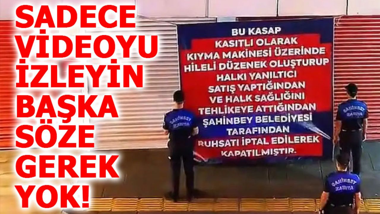 "Bu kasap, kasıtlı olarak kıyma makinesi üzerinde hileli düzenek oluşturup halkı yanıltıcı satış yaptığından ve halk sağlığını tehlikeye attığından dolayı Şahinbey Belediyesi tarafından ruhsatı iptal edilerek kapatılmıştır."