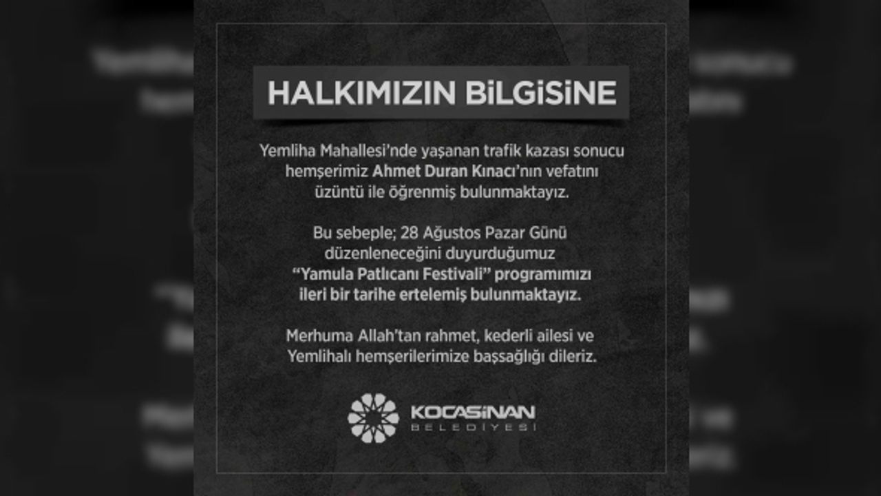 "Geçtiğimiz günlerde Yemliha Mahallesi’nde yaşanan trafik kazası sonucu 21 yaşındaki hemşerimiz Ahmet Duran Kınacı’nın vefatını üzüntü ile öğrenmiş bulunmaktayız. Bu nedenle Kocasinan Belediyesi tarafından 28 Ağustos Pazar Günü Yemliha Mahallesi’nde düzenleneceği duyurulan ‘Yamula Patlıcanı Festivali’ programımız ileri bir tarihe ertelenmiştir. Merhuma Allah’tan rahmet, kederli ailesi ve Yemlihalı hemşerilerimize başsağlığı dileriz."
