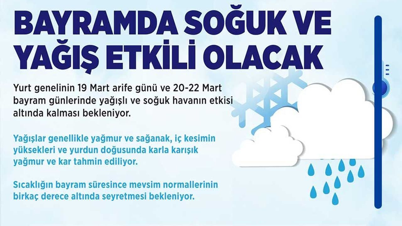Bayram boyunca yağışların genellikle yağmur ve sağanak şeklinde olacağı, ancak iç kesimlerin yüksekleri ile yurdun doğusunda karla karışık yağmur ve kar yağışının görüleceği tahmin ediliyor.