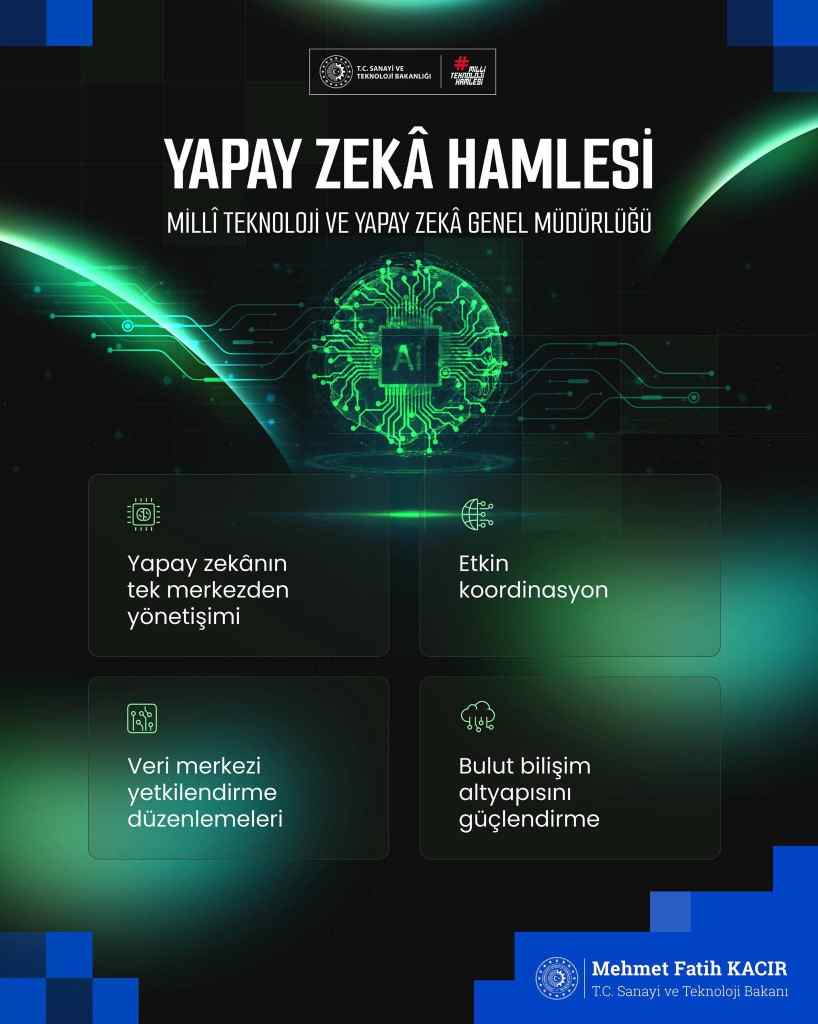 Bakan Kacır, sosyal medya hesabından yaptığı paylaşımda, Sanayi ve Teknoloji Bakanlığı bünyesindeki Milli Teknoloji Genel Müdürlüğü’nün bugünden itibaren yeni ismiyle faaliyetlerine devam edeceğini duyurdu. Ayrıca Cumhurbaşkanlığı Siber Güvenlik Başkanlığı bünyesinde “Kamu Yapay Zeka Genel Müdürlüğü” kurulduğunu da bildirdi.