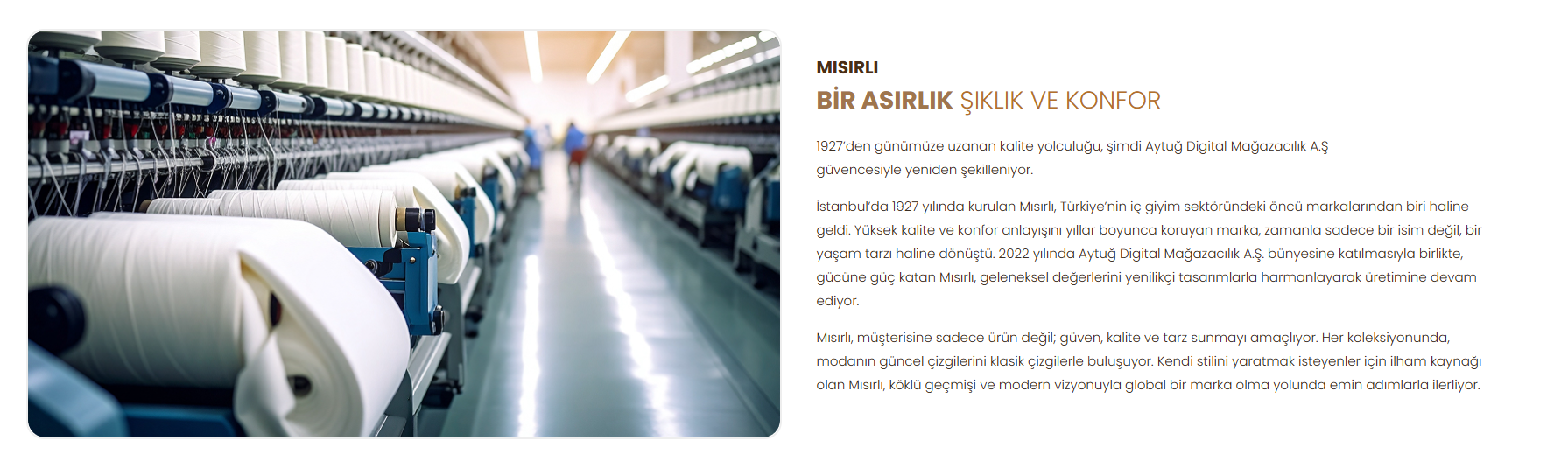 MISIRLI Underwear and Socks firma yöneticileri, ürettikleri yüksek kapasiteli çorap ve iç çamaşırı hatlarını öne çıkarıyor: Üç fabrikada yıllık 60–65 milyon çift üretim yaptıkları ve bunun %80’inin Hugo Boss, Tommy Hilfiger, Calvin Klein gibi dünya markalarına ihraç edildiği belirtiliyor.