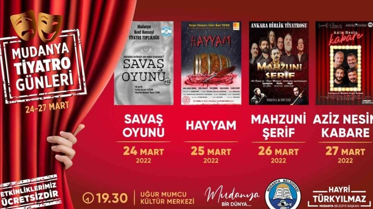 Mudanya Tiyatro Günleri başlıyor. Mudanya Belediyesi, 24-27 Mart tarihlerinde 4 farklı oyunu tiyatroseverlerle buluşturuyor. Mudanya Tiyatro Günleri kapsamında Mudanya Kent Konseyi oyuncuları “Savaş Oyunu” ile 24 Mart’ta, Ekim Sanat oyuncuları “Hayyam” ile 25 Mart’ta, Ankara Birlik Tiyatrosu oyuncuları “Mahzuni Şerif” ile 26 Mart’ta, İzmir Halk Tiyatrosu oyuncuları “Aziz Nesin Kabare” ile 27 Mart’taUğur Mumcu Kültür Merkezi’nde seyirciyle buluşacak. Mudanya Tiyatro Günleri etkinlikleri kapsamında Cengiz Toraman’ın yönettiği Levent Üzümcü, Ali Hakan Beşen, Mehmet Küçükgünaydın ve Cengiz Toraman’ın sahnelediği “Aziz Nesin Kabare”, Ali Öztunç’un yazdığı, Gül Göker’in oyunlaştırdığı, Murat Sarı’nın yönettiği “Mahzuni Şerif”, Ömer Naci Topçu’nun yazıp yönettiği “Hayyam” ile Mudanya tiyatroya doyacak.