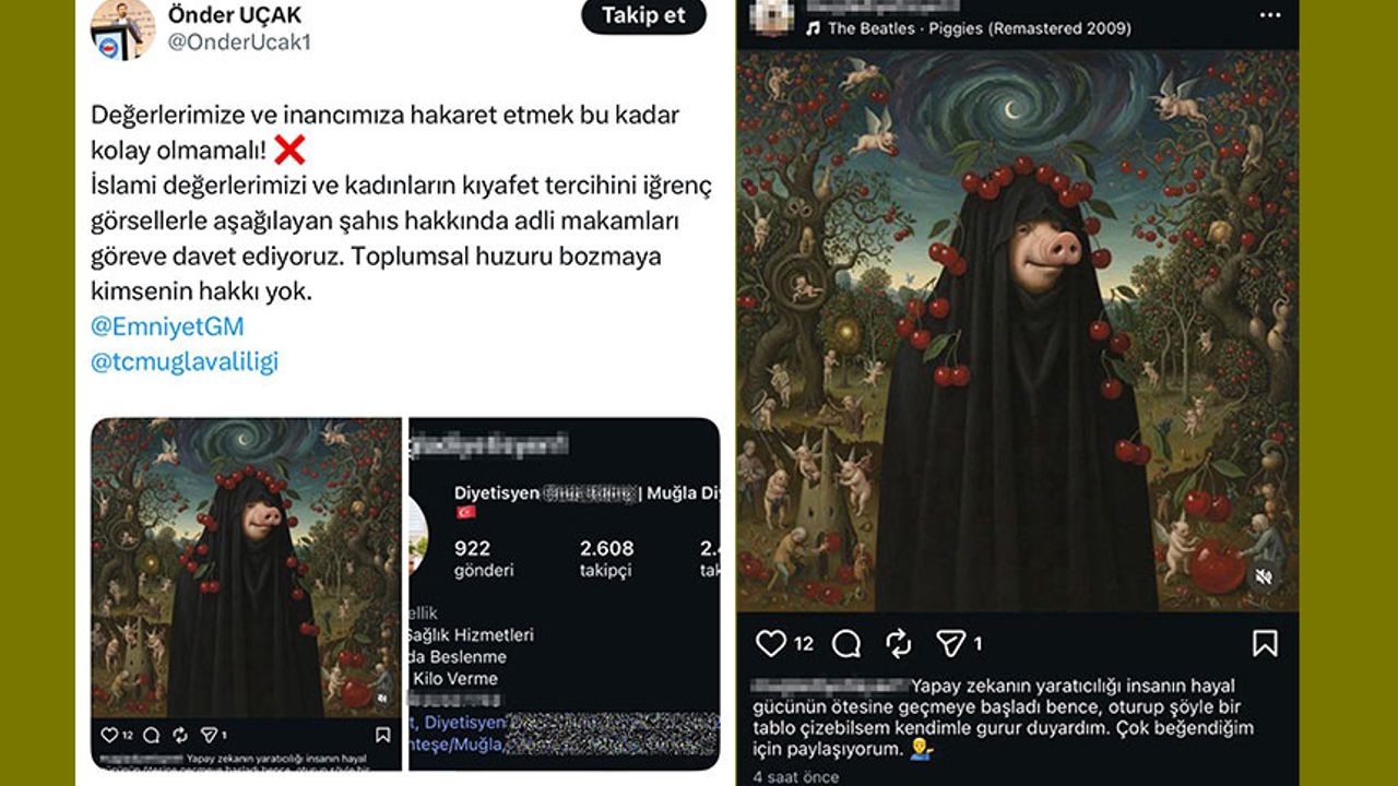 Muğla’nın Menteşe ilçesinde diyetisyen olarak görev yaptığı öğrenilen O.K.’ye ait sosyal medya hesabından paylaşılan ve yapay zeka ile oluşturulduğu belirtilen bir görsel, kısa sürede sosyal medyada gündem oldu. Bazı kesimler tarafından “çarşaf giydirilmiş domuz figürü” olarak nitelendirilen içerik, dini değerlere ve tesettürlü kadınlara yönelik hakaret olarak yorumlandı.