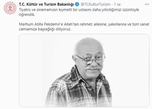 Kültür ve Turizm Bakanlığı'nın Twitter hesabından yapılan paylaşımda, "Tiyatro ve sinemamızın kıymetli bir ustasını daha yitirdiğimizi üzüntüyle öğrendik. Merhum Atilla Pekdemir'e Allah'tan rahmet; ailesine, yakınlarına ve tüm sanat camiamıza başsağlığı diliyoruz." denildi.