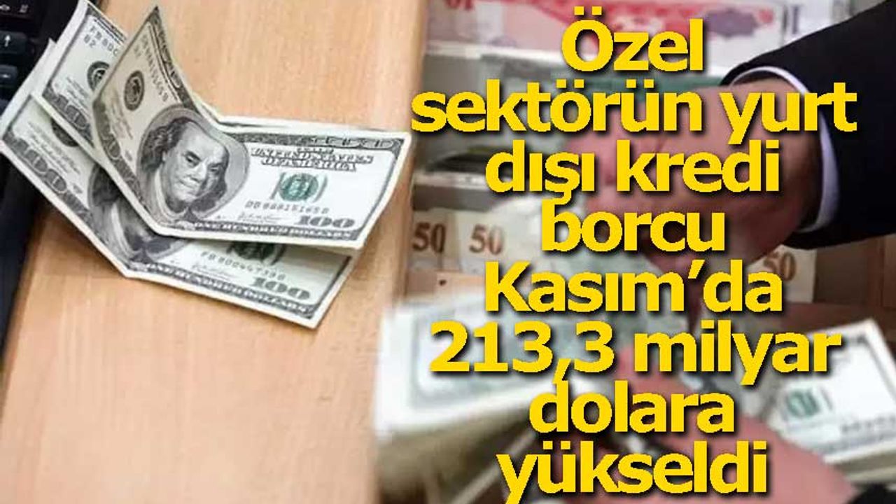 Buna göre, özel sektörün yurt dışından sağladığı toplam kredi borcu, Kasım ayında bir önceki aya göre 2,4 milyar dolar artarak 213,3 milyar dolar oldu.