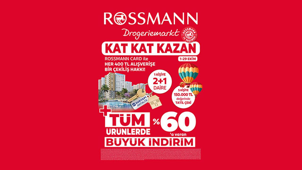 Türkiye’deki 15’inci yılını kutlayan Rossmann’ın, 1–29 Ekim 2025 tarihleri arasında geçerli olacak “Kat Kat Kazan” çekiliş kampanyası kapsamında; tüm ürünlerde %60’a varan indirimler uygulanacak. Ayrıca Rossmann Kart sahiplerine Rossmann mağazaları ile online satış platformlarında yapacakları her 400 TL’lik alışveriş harcamasına 1 adet çekiliş hakkı verilecek.