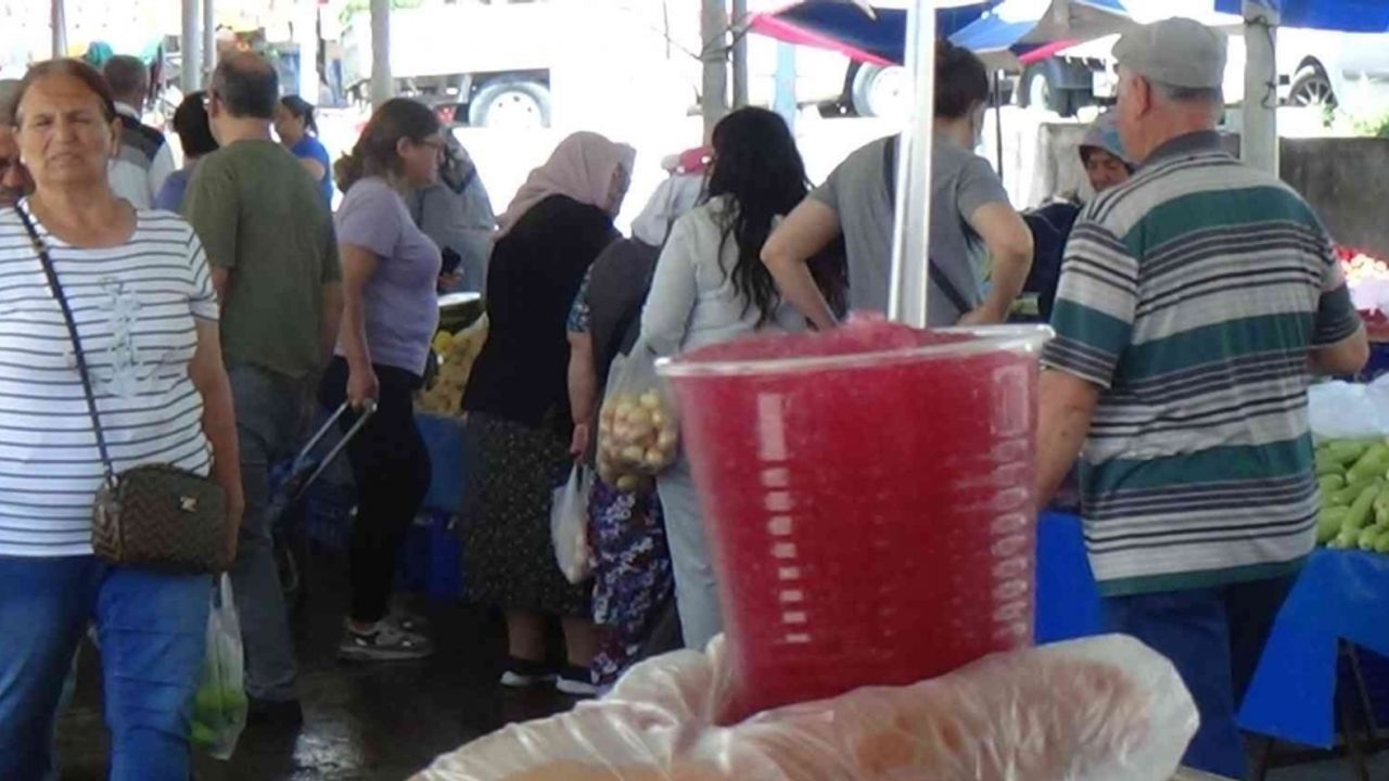 Muğla’nın Menteşe ilçesinde Perşembe günler kurulan halk pazarında kar şerbeti tezgahı açan vatandaş satışlardan memnun. Bardağı 5 liradan satılan kar şerbetine sıcak havadan bunalan vatandaşlar tezgahta hem nefesleniyor, hem de seriliyor.
