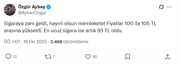 Aybaş, sosyal medya hesabından yaptığı paylaşımda, “Sigaraya zam geldi, hayırlı olsun memlekete! Fiyatlar 100 ila 105 TL arasına yükseldi. En ucuz sigara ise artık 95 TL oldu” ifadelerini kullandı.