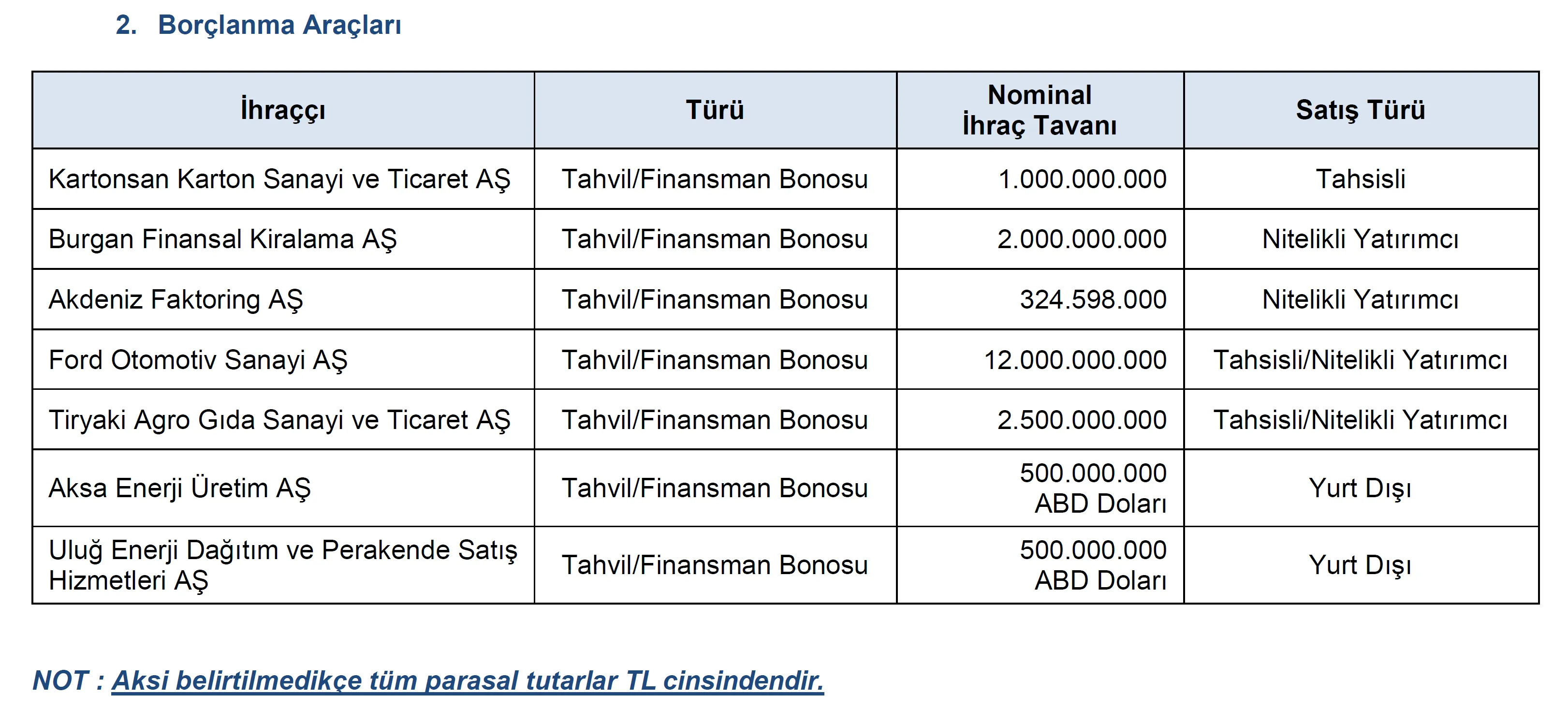 Bültende yer alan bilgilere göre, Kartonsan Karton Sanayi, 1 milyar TL tutarındaki tahvil/finansman bonosunu tahsisli satış yöntemiyle ihraç edecek. Burgan Finansal Kiralama ise yalnızca nitelikli yatırımcılara yönelik 2 milyar TL nominal tutarlı borçlanma aracı ihracı için onay aldı.
