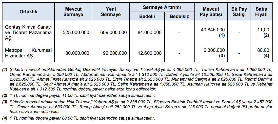 Gentaş Kimya’nın mevcut sermayesi 525 milyon TL. Halka arzla birlikte bu sermaye 84 milyon TL artacak ve toplam 609 milyon TL’ye çıkacak. Ayrıca şirketin mevcut ortaklarının sahip olduğu 40,8 milyon TL’lik paylar da satışa sunulacak. Yatırımcılar, 1 TL nominal değerli payları 11 TL sabit fiyattan alabilecek. Tüm paylar satılırsa, halka arz büyüklüğü yaklaşık 1,37 milyar TL olacak.