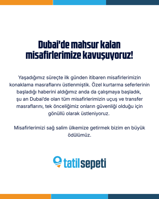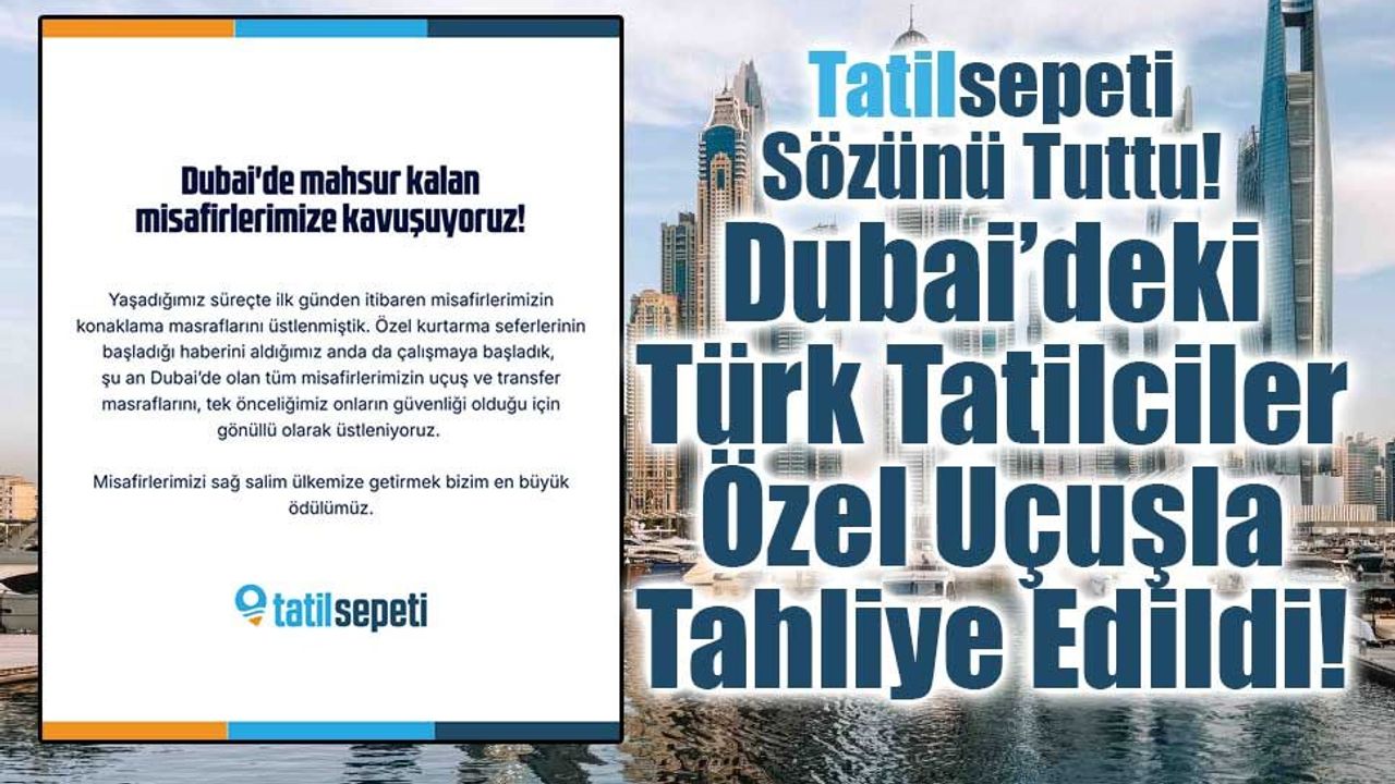 İsrail ve ABD’nin İran’a yönelik saldırıları sonrasında bölgede yaşanan hava sahası kısıtlamaları nedeniyle Dubai’de mahsur kalan yolcular için Tatilsepeti tarafından tahliye operasyonu gerçekleştirildi. Tatilsepeti, yolcularını özel uçuşla Türkiye’ye getirdi.