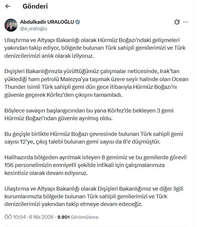 Bakan Uraloğlu, "Ocean Thunder isimli Türk sahipli gemi dün gece Hürmüz Boğazı’nı geçti. Böylece savaşın başından bu yana Körfez’de bekleyen 3 gemi boğazdan güvenle ayrılmış oldu" ifadelerini kullandı.