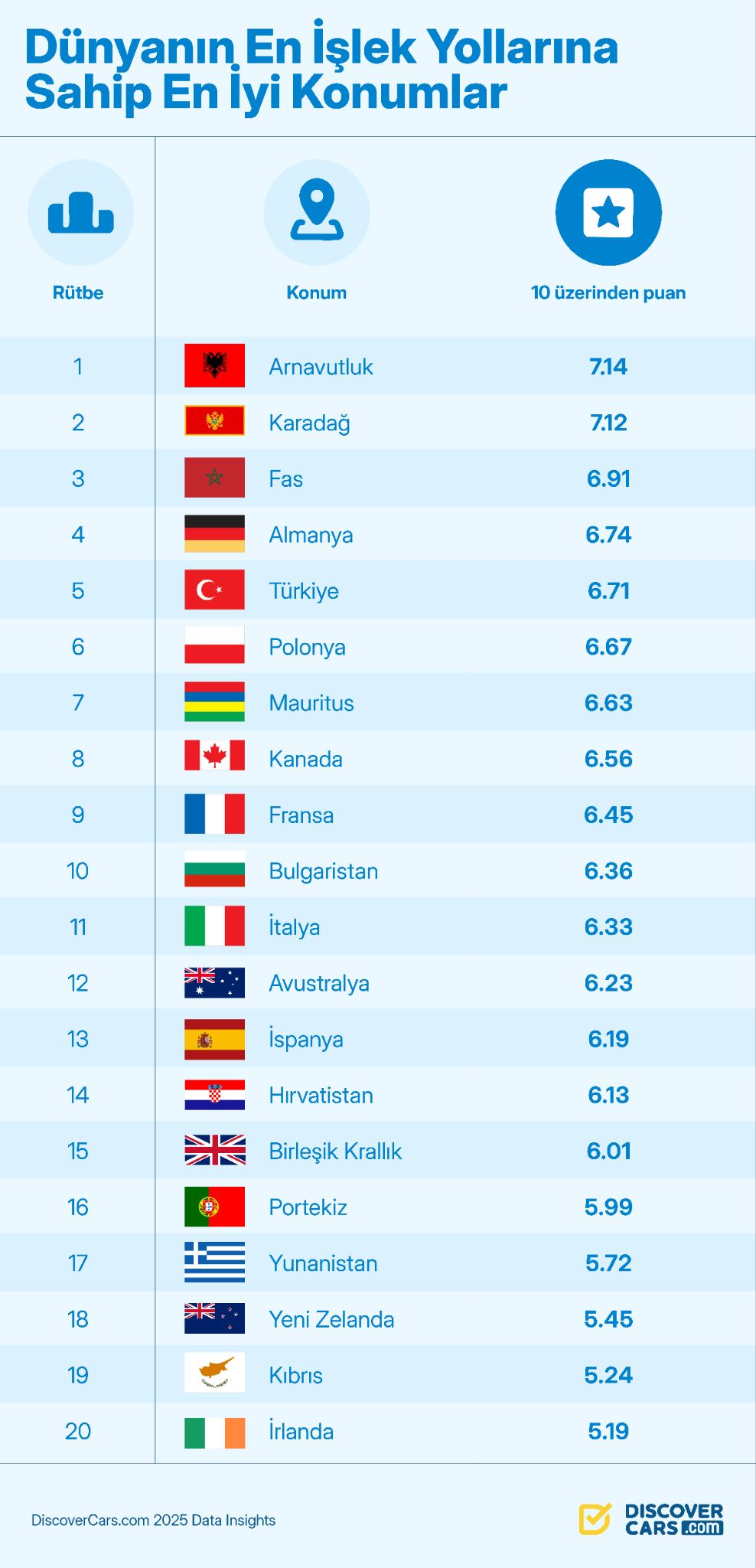 Türkiye, 10 üzerinden 6,71 puan alarak listenin beşinci sırasında yer aldı. Özellikle İstanbul’da seyahatin yoğun olduğu saatlerde trafik sıkışıklığı ve tıkanıklık yaşanabileceği vurgulandı. DiscoverCars.com, Türkiye’de araç kullanmanın keyifli olabileceğini ancak yoğun saatlerde işlek güzergahlardan kaçınmanın faydalı olacağını belirtti.