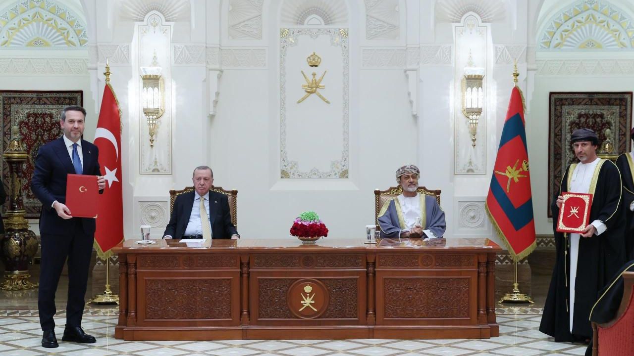 Cumhurbaşkanı Recep Tayyip Erdoğan, Umman temaslarını sürdürüyor. Başkent Maskat'taki Al Alam Sarayı'nda Erdoğan ile Umman Sultanı Heysem bin Tarık bin Teymur Al Said'in başkanlık ettiği heyetlerarası toplantının ardından imza töreni düzenlendi. Törende iki ülke arasında "Medya ve İletişim Alanında İş Birliğine İlişkin Mutabakat Zaptı" dahil 16 belge imzalandı. Cumhurbaşkanı Erdoğan'ın, Umman Sultanı Heysem bin Tarık bin Teymur Al Said tarafından onuruna verilen resmi yemeğe katılarak, ülkeye dönmesi bekleniyor.