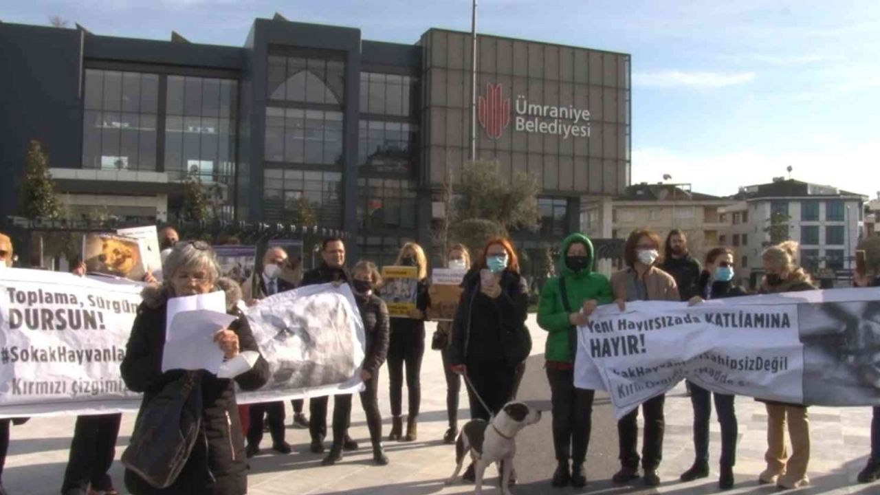 Ümraniye Belediye binası önünde toplanan hayvanseverler, sokak hayvanlarının korunmasına ve hayvanların sağlık işlemlerinin gerçekleştirilmesine yönelik sloganlar atarak basın açıklaması yaptı.