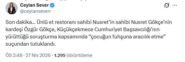 Habertürk'ten Ceylan Sever'in aktardığına göre Özgür Gökçe, “çocuğun fuhşuna aracılık etme” suçlamasıyla gözaltına alındıktan sonra sevk edildiği adliyede çıkarıldığı mahkeme tarafından tutuklanarak cezaevine gönderildi.