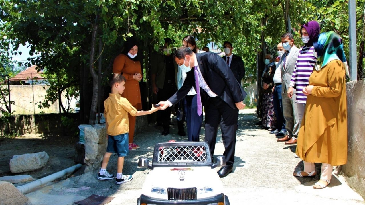 Amasya Valisi Mustafa Masatlı, 15 Temmuz şehidi Erdem Diker’in 6,5 yaşındaki oğlu Egehan’a akülü araba hediye etti.
