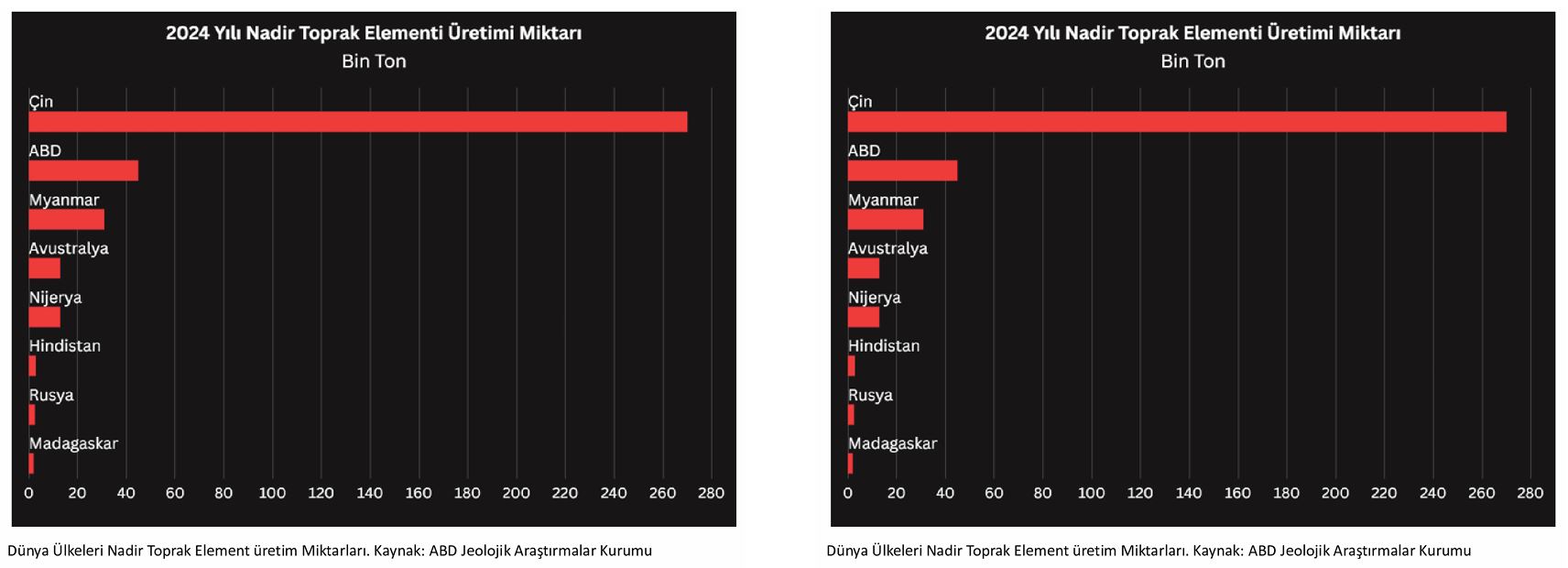 Sadece bu elementler değil, elektrikli araçların motorlarında özellikle kullanılan nadir toprak elementleri için de şimdilik görünmez bir ticari savaş başlamıştır. Nadir toprak elementleri, elektrikli araçların elektrik motorlarında neodimyum-demir-boron (NdFeB) mıknatısları olarak kullanılmaktadır. Bu mıknatıslar, elektrikli araçların verimliliğini ve menzilini artırmak, daha hafif ve güçlü motorlar üretmek açısından büyük önem taşımaktadır. Ayrıca yüksek sıcaklıklarda manyetizmanın korunması, dayanıklılığın artırılması, daha yüksek manyetik alan oluşturulması ve motor performansının yükseltilmesi için praseodimyum, terbiyum ve disprosyum gibi nadir toprak elementlerine ihtiyaç vardır.