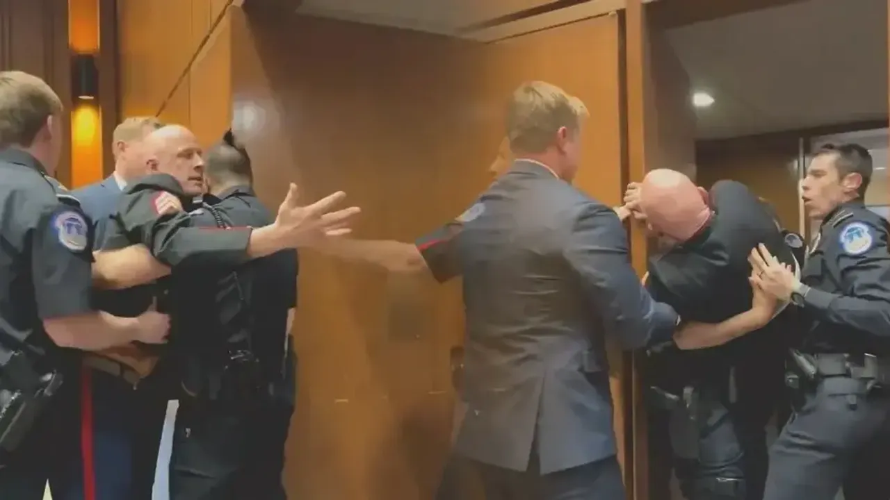 ABD Deniz Piyadeleri’nde görev yapmış olan ve yaklaşan seçimlerde Yeşiller Partisi’nden Senato aday adayı olan Brian McGinnis, oturum sırasında sözlü protestoda bulundu. McGinnis, görevliler tarafından salondan çıkarılmaya çalışılırken kapıya tutunarak...
