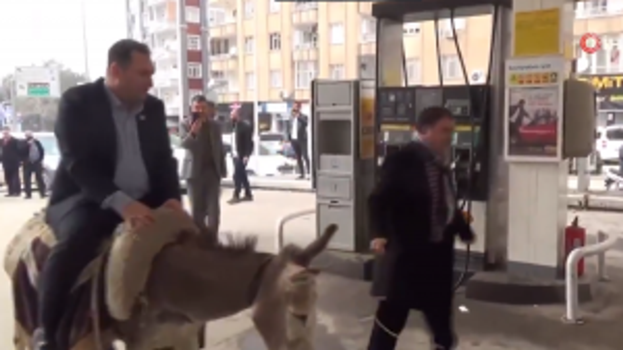 Gaziantep'te akaryakıt zamlarını protesto etmek isteyen Gelecek Partisi Nizip İlçe Başkanı Mehmet Danaoğlu, bindiği eşekten inerken düştü.