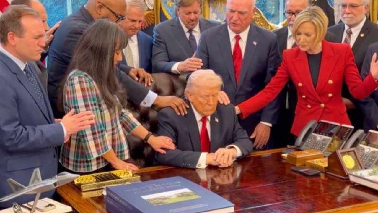 Trump’ın danışmanı Margo Martin tarafından sosyal medyada paylaşılan görüntülerde, başkanın masasının arkasında otururken çevresinde bir dua çemberi olduğu görüldü. Evangelist din liderleri, Trump’a dokunarak ona manevi destek verdi.