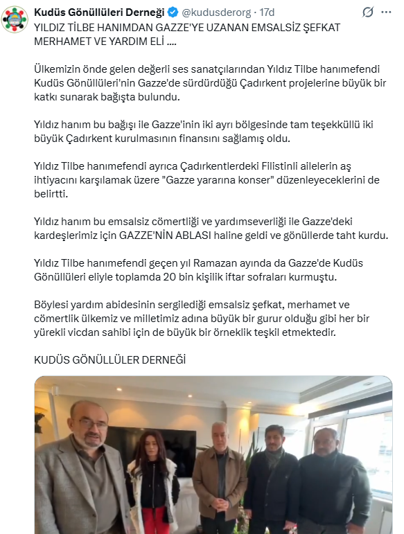 Yıldız Tilbe’nin insani yardım çalışmalarının ilk olmadığına dikkat çekilen açıklamada, sanatçının geçtiğimiz yıl Ramazan ayında da Gazze’de Kudüs Gönüllüleri aracılığıyla toplam 20 bin kişilik iftar sofralarının kurulmasına destek verdiği hatırlatıldı.
