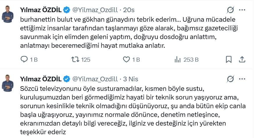 Kanal, Özdil’in istifasından kısa bir süre önce, 3 Nisan Cuma akşamı saat 18:15’te beklenmedik bir teknik arıza nedeniyle yayını durdurmak zorunda kalmıştı. Sözcü TV yetkilileri, sorunun kaynağının henüz netleşmediğini ve son dönemde kanala yönelik artan baskıları araştırdıklarını açıkladı.
