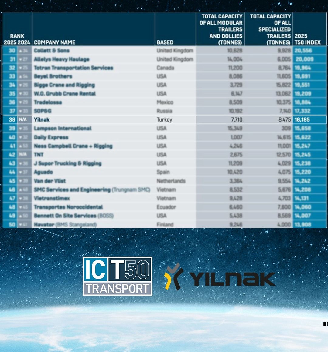 Dünyanın önde gelen sektörel yayınlarından International Cranes and Specialized Transport (ICST) dergisinin her yıl yayınladığı IC Transport 50 listesinde resmi olarak dünya genelinde 38’inci, Avrupa’da ise 8’inci sırada yerini aldı. Bu sonuç, Yılnak’ın mühendislik gücü, modern ekipman parkı ve global vizyonu sayesinde elde ettiği istikrarlı yükselişi gözler önüne serdi.