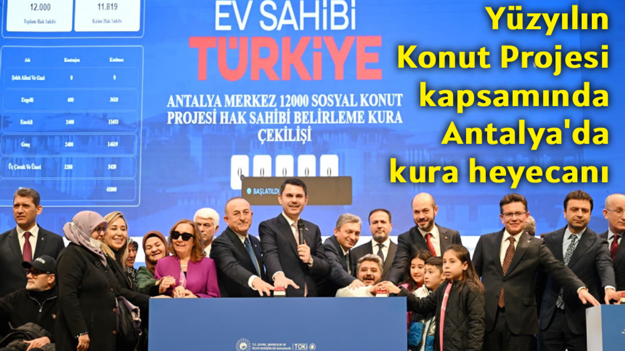 Antalya'da yapılacak 13 bin 213 sosyal konut için kura çekimi Mimar Sinan Kongre Merkezi'nde düzenlendi. Çevre, Şehircilik ve İklim Değişikliği Bakanı Murat Kurum'un da katıldığı tören, çok sayıda hak sahibi adayının yoğun ilgisiyle gerçekleştirildi.