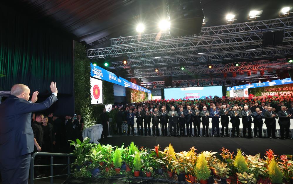 On binlerce aileyi yeni yuvalarıyla buluşturduklarını söyleyen Cumhurbaşkanı Erdoğan, "Dar gelirli kardeşlerimizin yüzlerini güldürdük. Vatandaşlarımızın kendi evlerini inşa edebilmeleri için altyapısı hazır arsaları kendilerine sunduk. Ana muhalefetin her fırsatta eleştirdiği TOKİ, çok büyük başarılara imza attı. TOKİ'yi bile imrendirecek dedikleri projeyi bile ellerine, yüzlerine bulaştırdılar. Bu muhalefetin en başarılı, en kabiliyetli yanı neydi? Çöp, çukur, çamur. Ev sahibi olmak umuduyla kendilerine güvenen insanlarımızı mağdur ettiler. Güya TOKİ'ye rakip olmak için çıktıkları yolda dolandırıcılıktan mahkemeye düştüler. Biz ise bugüne kadar tam 1 milyon 740 bin sosyal konutu milletimizin emrine verdik. Dar gelirli 5 milyon vatandaşımızı camileriyle, parklarıyla, yürüyüş yollarıyla modern, sağlam ve çevre dostu yaşam alanlarına biz kavuşturduk. Aynı şekilde afet bölgelerinde de çok büyük bir gayret ortaya koyduk. Başta 6 Şubat'ta kaybettiklerimiz olmak üzere ebediyete uğurladığımız kardeşlerimizi geri getirmek, biliyoruz ki mümkün değil. Ama şehirlerimizi yeniden dizayn etmek, depreme dayanıklı evler inşa etmek bizim elimizde. Tedbir bizden, takdir Allah'tandır" diye konuştu.
