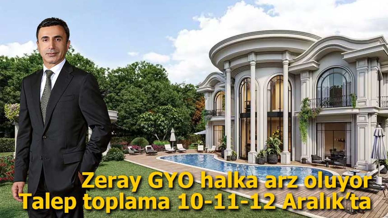 Geleceği öngören yönetim anlayışı, uzman kadrosu ve deneyimli işgücüyle özgün, yenilikçi ve yüksek kaliteli projelere imza atan Zeray Gayrimenkul Yatırım Ortaklığı (Zeray GYO), halka arz ediliyor. 12 konut projesiyle toplam 17 milyar 127milyon 674 bin 866 TL’lik bir portföy büyüklüğüne sahip olan Zeray GYO’nun halka arzında pay başına satış fiyatı 13,00 TL olarak belirlendi. Ziraat Yatırım Menkul Değerler A.Ş. ve İntegral Yatırım Menkul Değerler A.Ş. liderliğinde gerçekleştirilecek halka arz 10-11-12 Aralık tarihlerinde “Sabit Fiyatla Talep Toplama” yöntemiyle yapılacak.